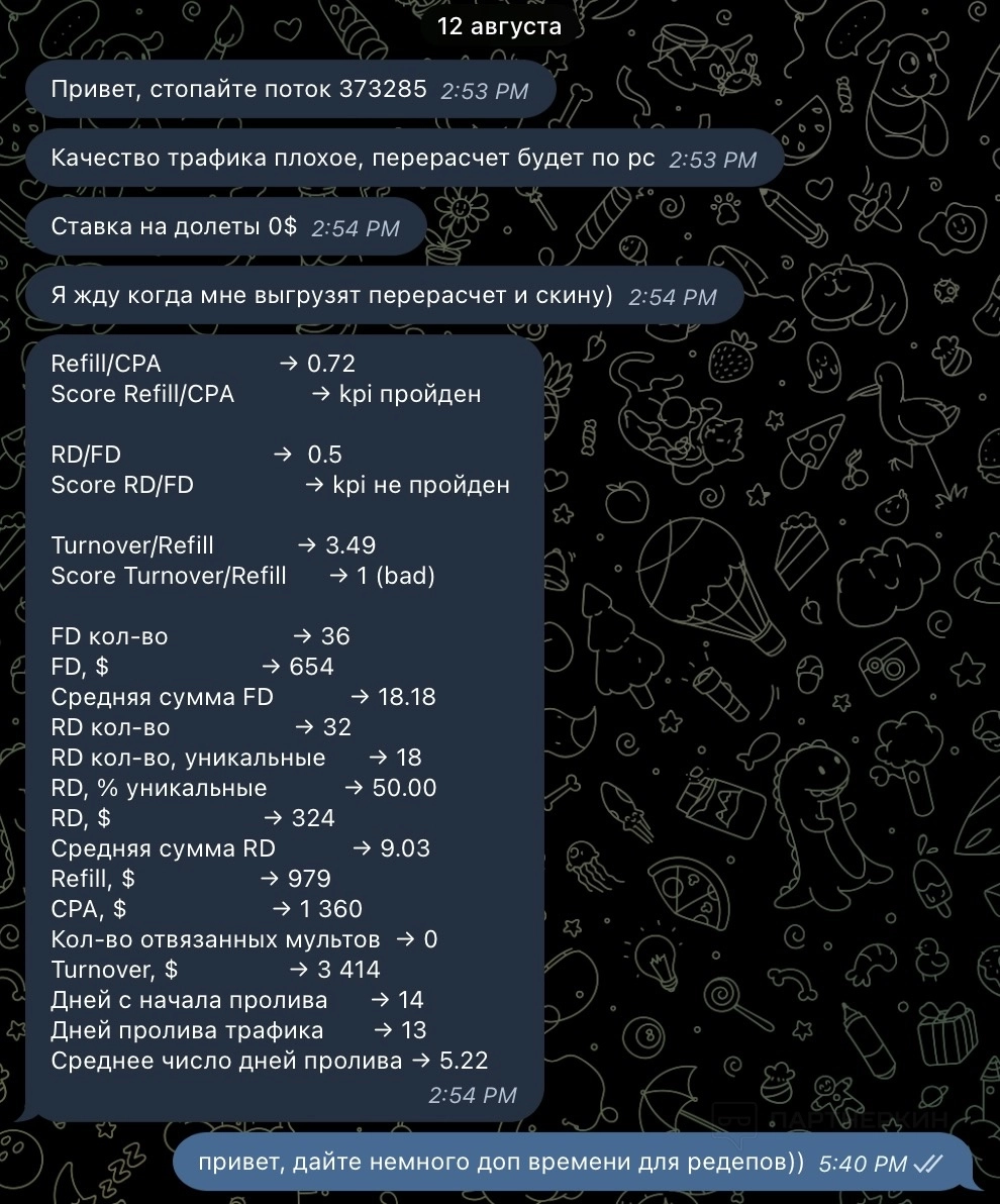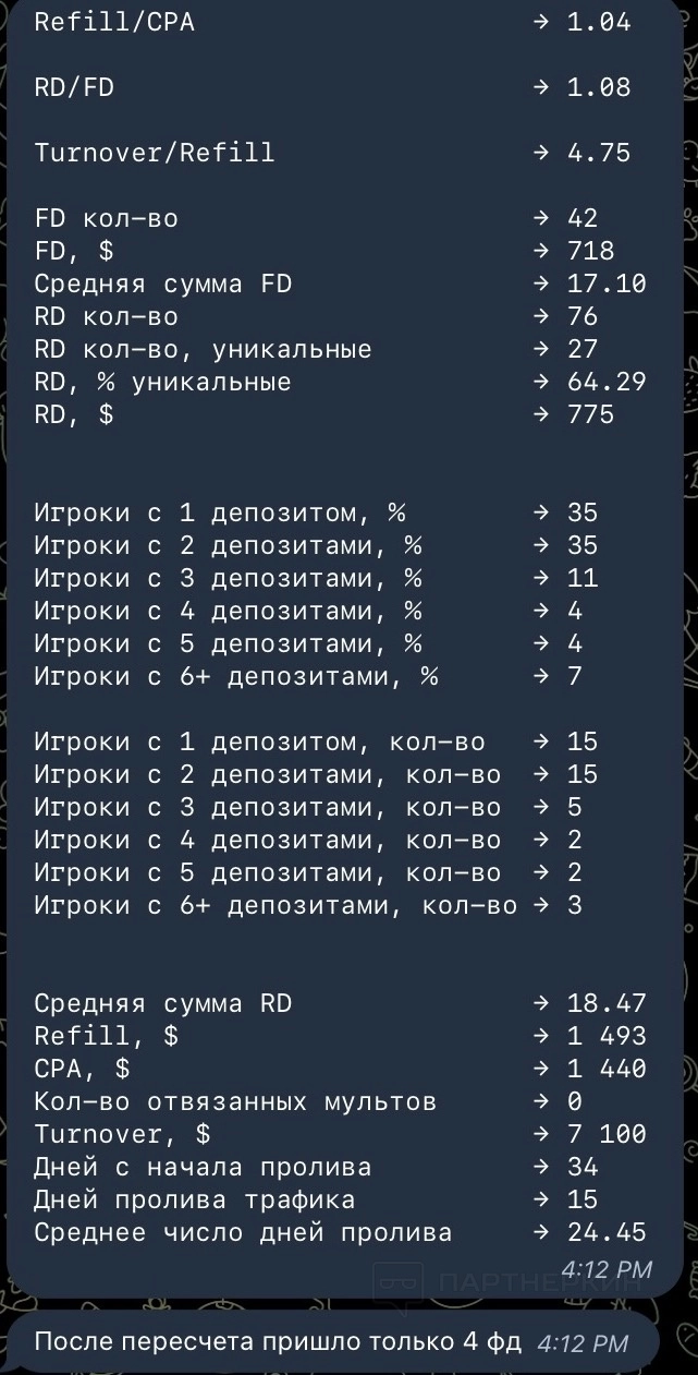 на тот момент мы шли с статой 1к1 по фд/рд, но правила есть правила, проверка трафика на 15-й день и как решение: перевод на оплату по RS 30% (НО ТОЛЬКО ЗА ПЕРИОД ОТЛИВА), на 15-й день всю прибыль с моих депозитеров продолжит получать продукт, а я остаюсь с выплатой в 79$ за весь трафик который привел в оффер.